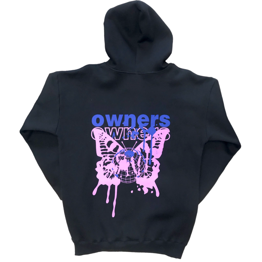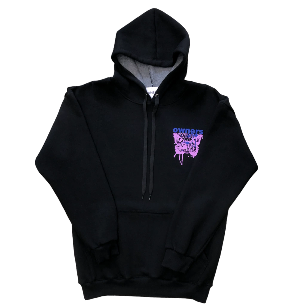 Buzo oversize en color negro, el favorito de los adolescentes, y a veces el único que usan. Tiene esta estampa hermosa en la espalda en color rosa y azul, una delicada combinación de colores. Es muy abrigado con frisa gruesa, para pasar calentitos el invierno.
