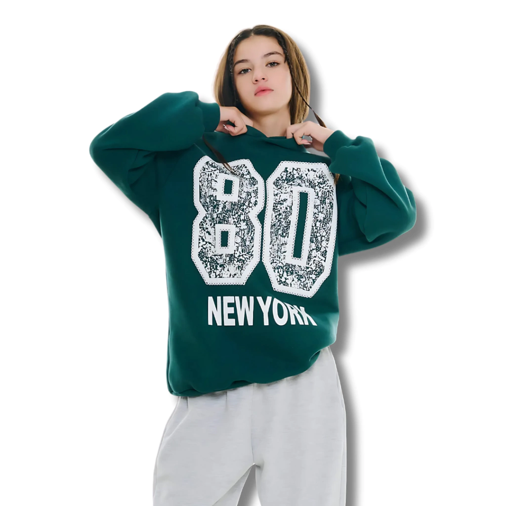 Buzo maxi en un color verde inglés precioso y estampa en relieve al frente. Tiene frisa para manterlas confortables y calentitas sin perder el estilo! Las chicas se sienten únicas usando estos buzos bien oversize. No hace falta que eljias talles más grandes porque su diseño ya es amplio y largo.