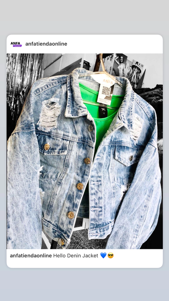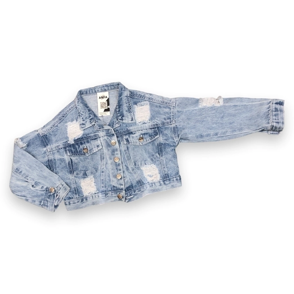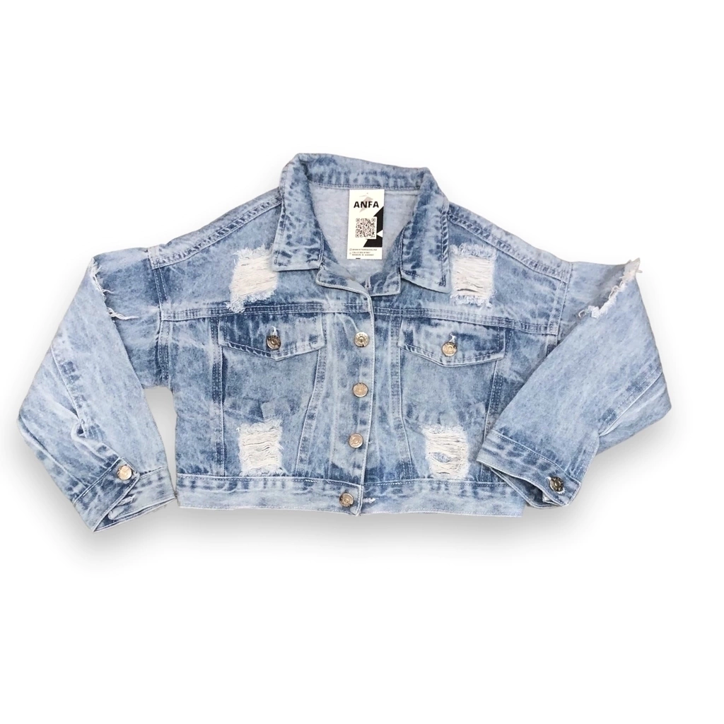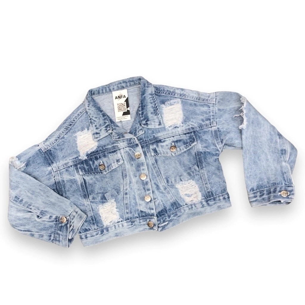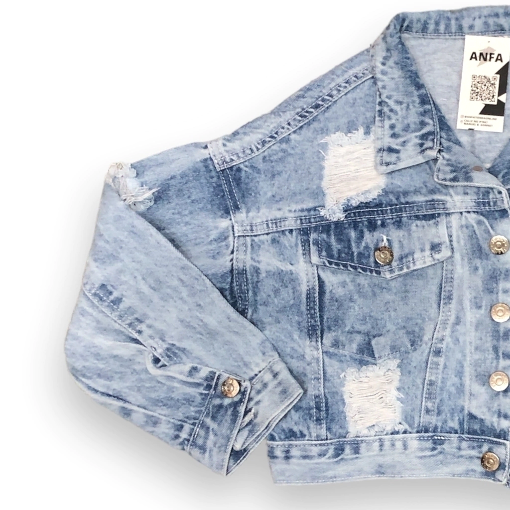 Campera de Jean denim rígido. Color Acid Blue, nevada con roturas. Corte a la cadera. Queda hermosa con todos sus outfits!