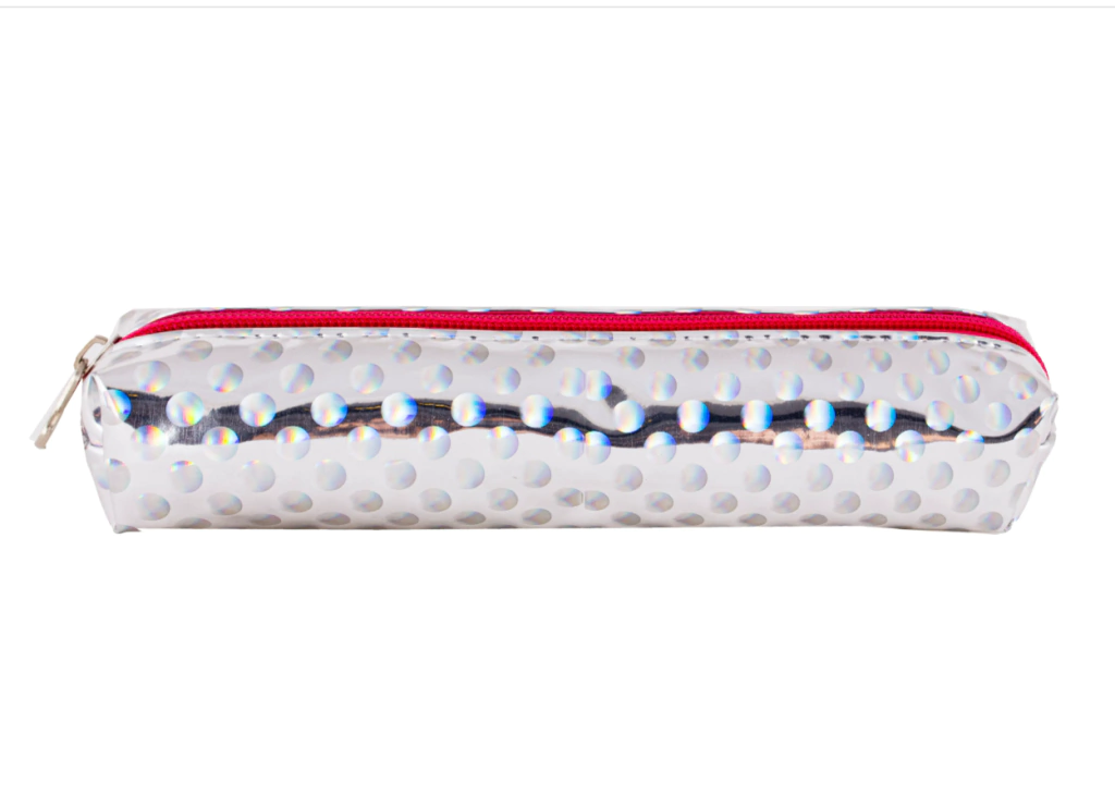 Cartuchera tubo color plata y cierre fucxia.