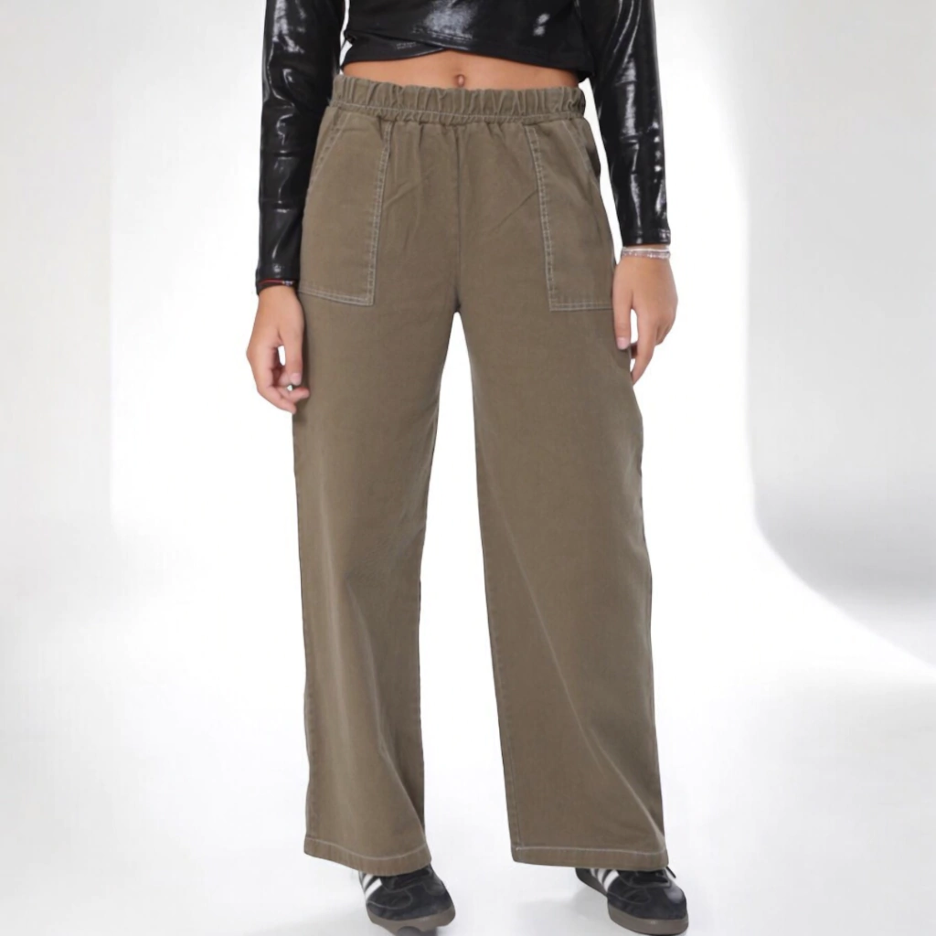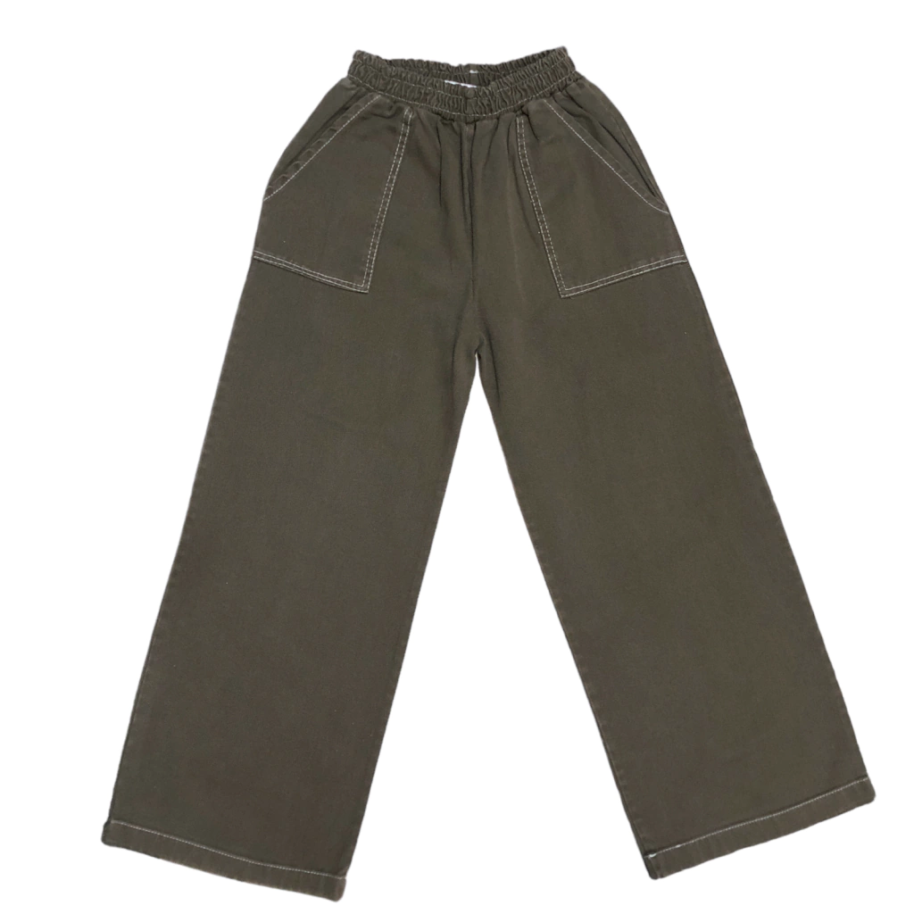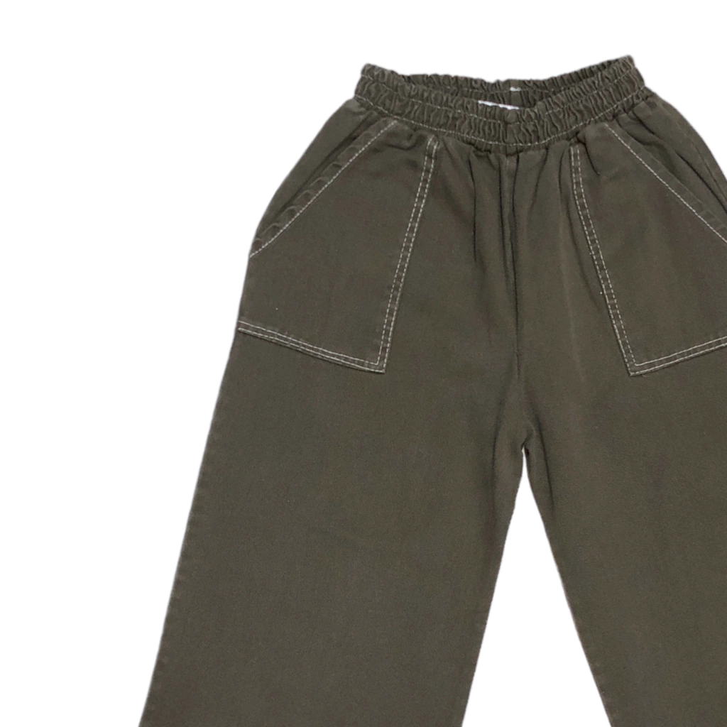 Pantalón Wide Leg de gabardina gruesa tipo palazzo en color verde militar. Este pantalón es un camino de ida para quienes buscan un look canchero y cómodo. Su diseño de tiro medio alto y piernas rectas anchas lo convierten en una pieza versátil que pueden usar con sus tops y buzos oversizes favoritos!