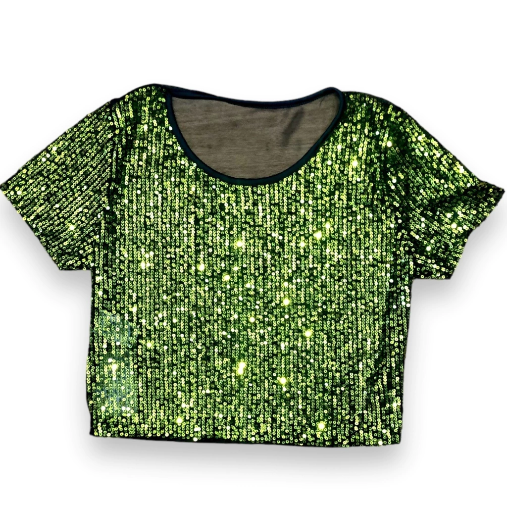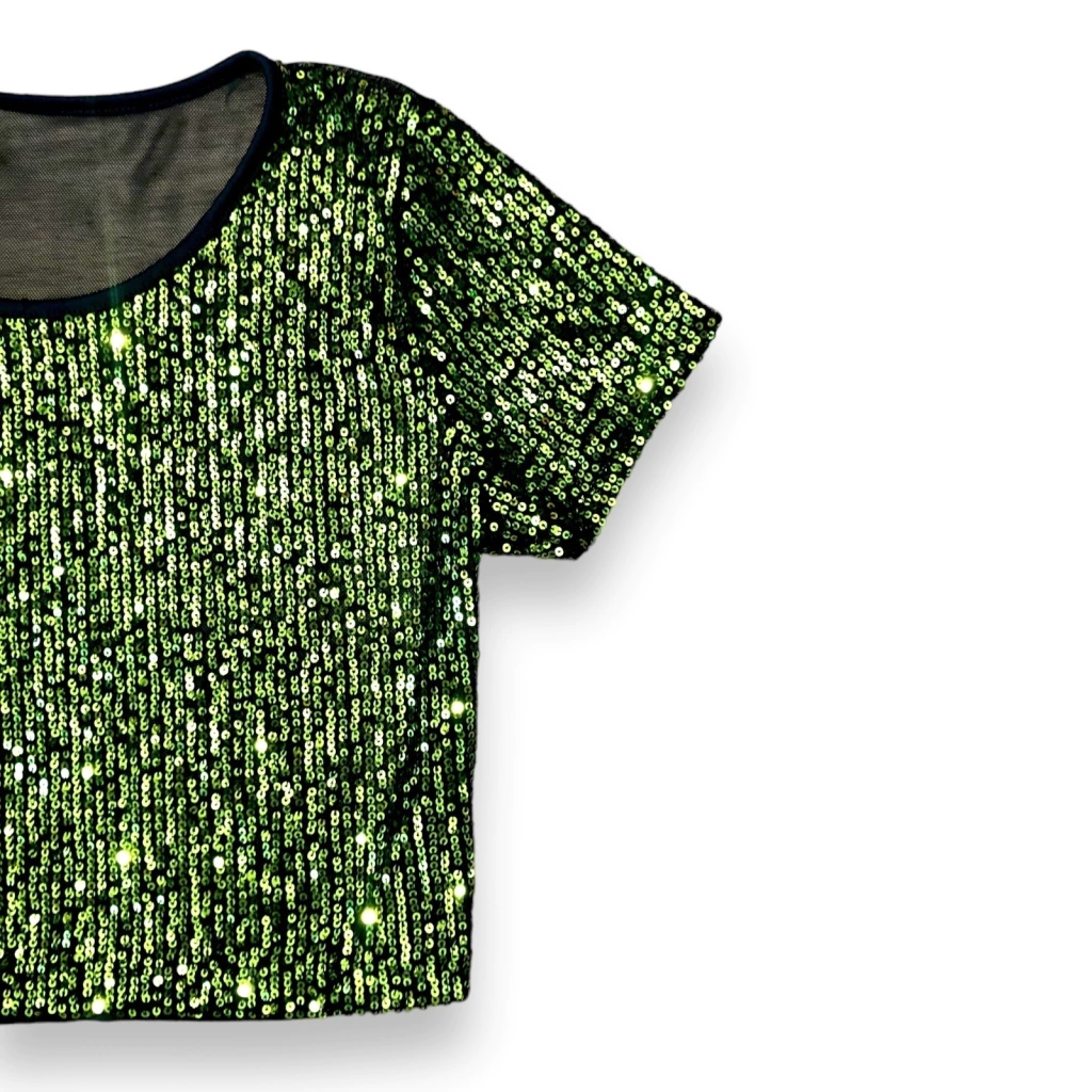 Remera corta con frente de paillete y espalda de microtul negro. Hermosa y muy delicada!