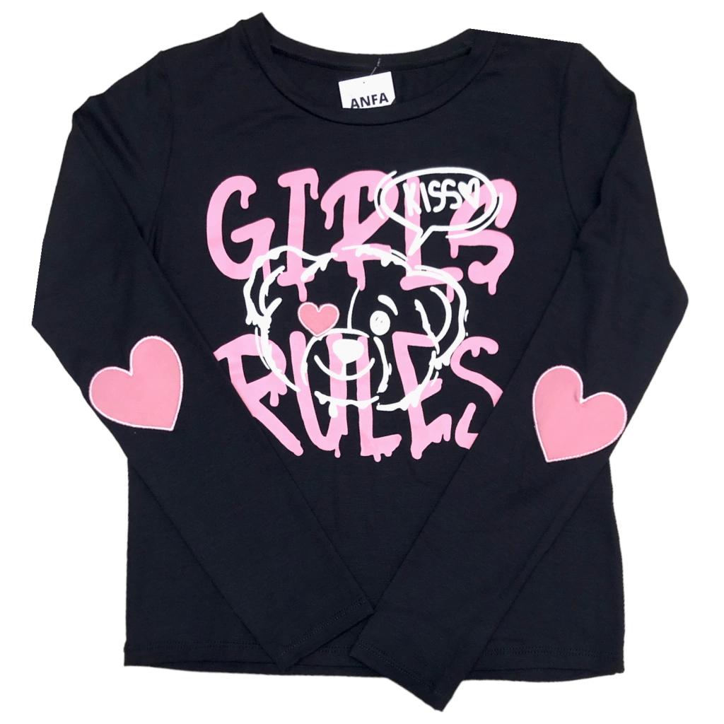 Remera mangas largas con estampa adelante y coderas bordadas en forma de corazón, es única! La van a amar! De modal soft premium color negro. Abarca un Talle 12 al 14 modelo al cuerpo corte a la cadera clásico. Son muy lindas!