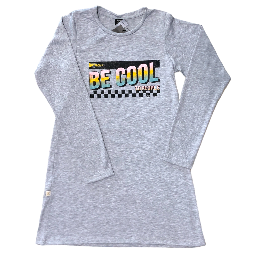 Vestido de algodon con estampa al frente, mangas largas y cuello redondo, corte evasé. Hermoso para usar con zapatillas o borcegos, con medias oscuras o superponer con leggins. Son súper versátiles!